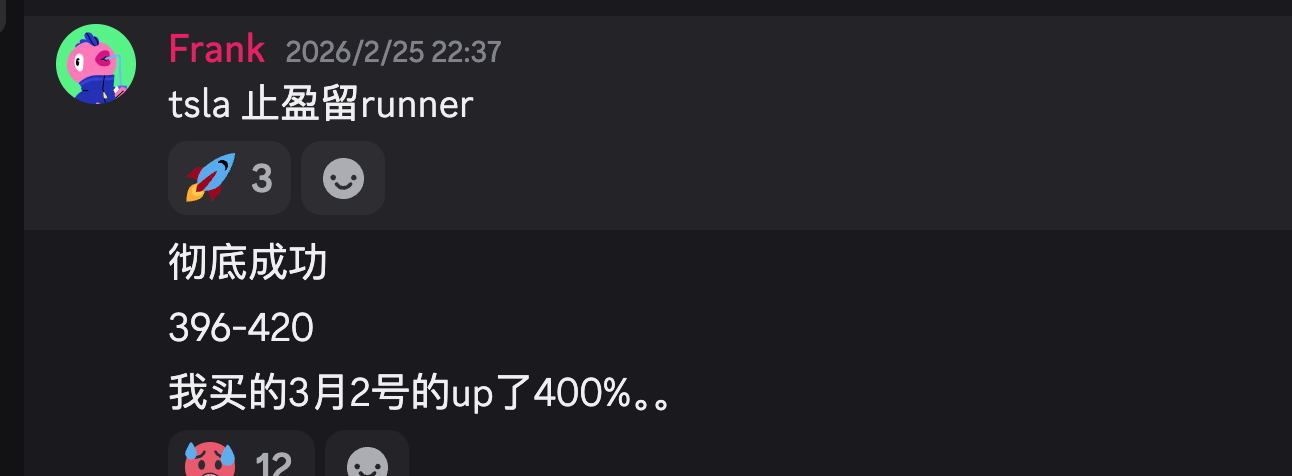 之后在tsla在ema100反弹的时候买入短call,并且在420的时候最高点精准止盈,两天即获利400%。