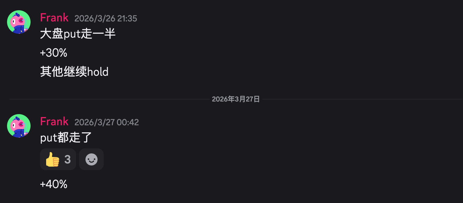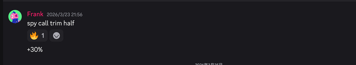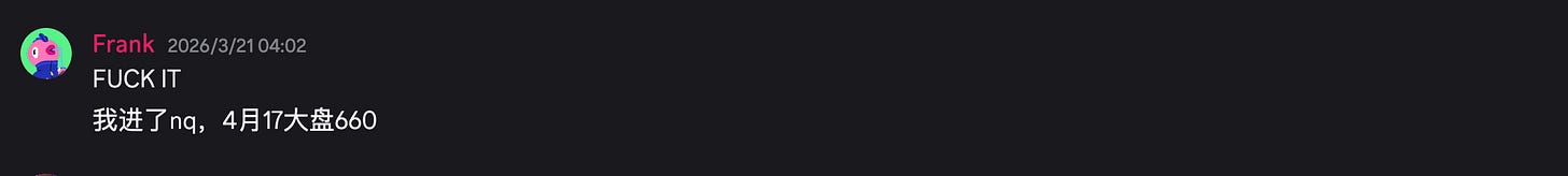 我们在3月20号发现了多头的投降信号,进入了spy call和nq期货,周一果然迎来了川普的taco,爆赚离场。